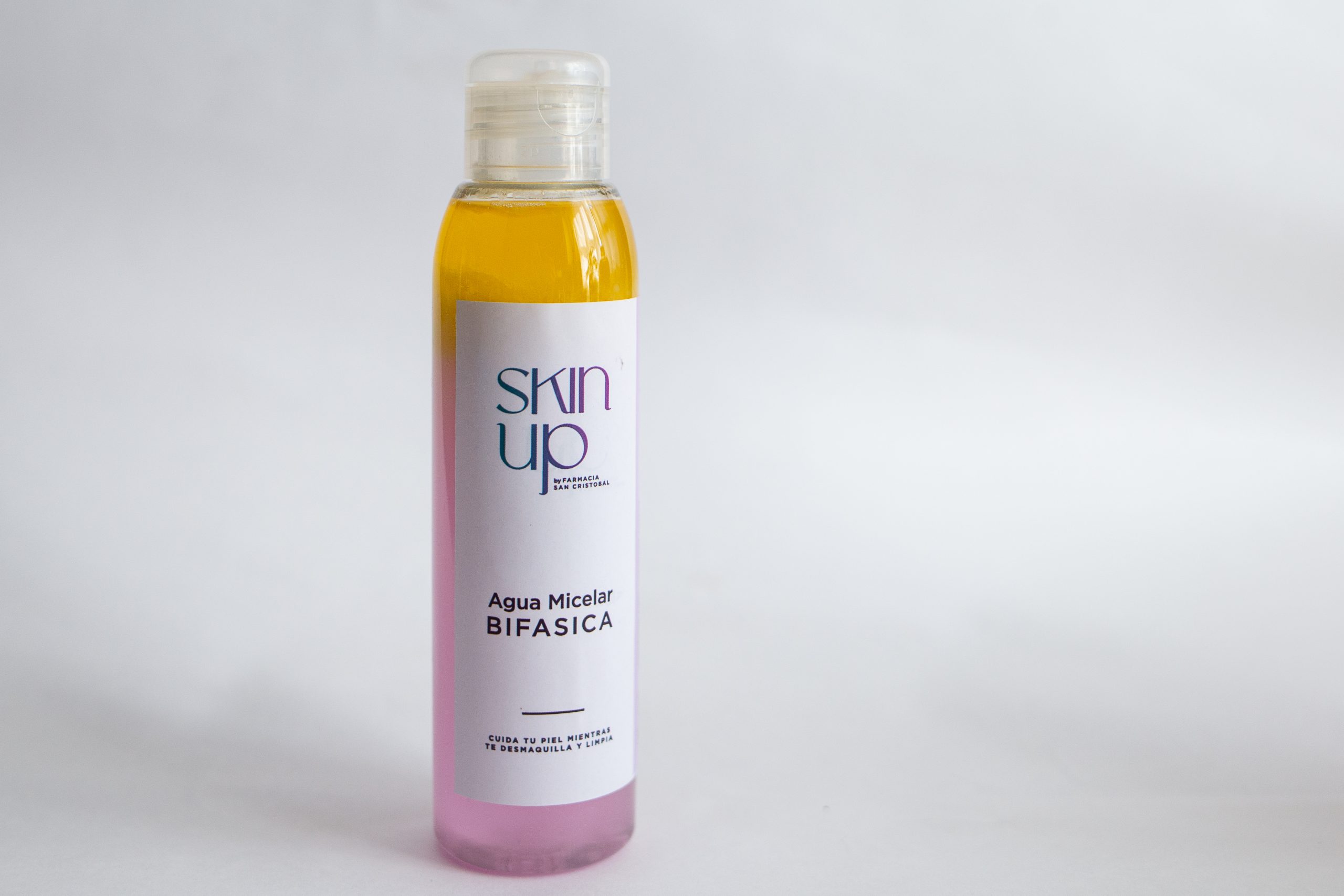 El Agua Micelar Bifasica remueve el maquillaje común y a prueba de agua en una pasada con un algodón o acopad.